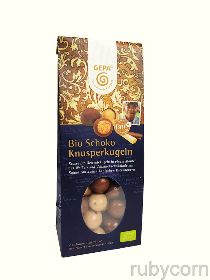 GEPA BIO Schoko Knusperkugeln mit dreierlei Schokolade umhüllt. Leckere Füllung aus Amaranth, Reis und Quinua. Mit Milch aus dem Berchtesgadener Land und Kakao von Kleinbauern aus Peru. Feine Confiserie – Getreideschokokugeln in Bioqualität und Fair Trade.