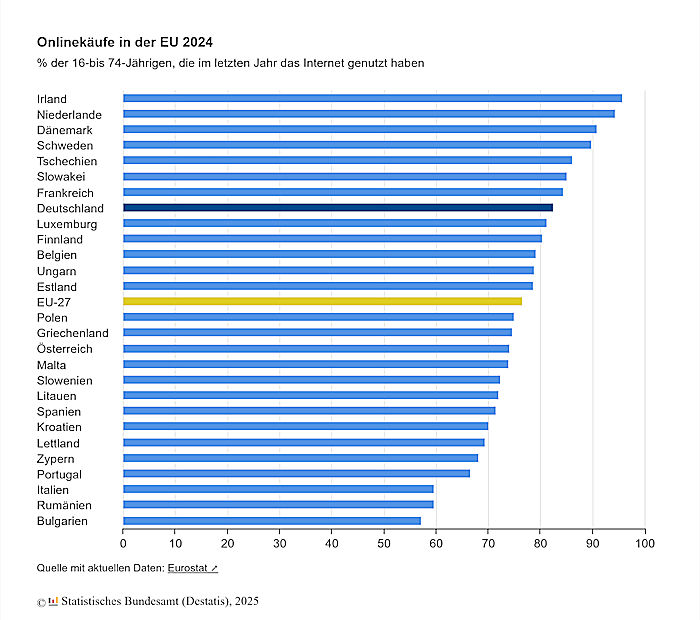 In Deutschland haben im Jahr 2024 rund 83 % der Internetnutzenden zwischen 16 und 74 Jahren mindestens einmal online eingekauft, womit Deutschland im EU-Vergleich auf Platz 8 liegt. Spitzenreiter sind Irland (96 %), die Niederlande (94 %) und Dänemark (91 %).