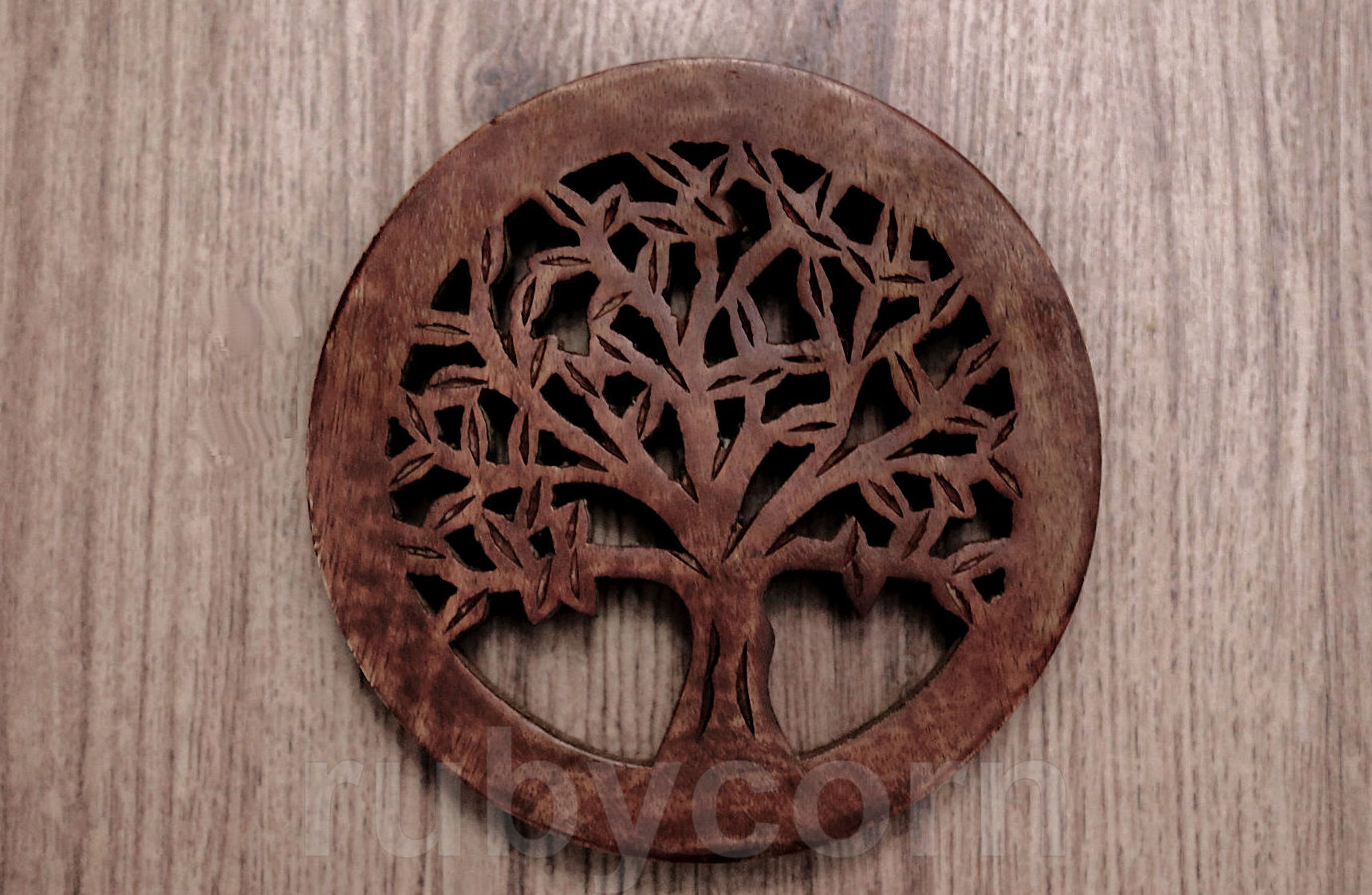 Topfuntersetzer mit Schnitzerei Motiv Baum Mangoholz