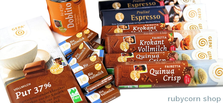 Faire Süßigkeiten. Tafel Schokolade oder Schokoriegel, Gebäck, Nüsse, Bonbons und Lollis. Feine Kompositionen in Bioqualität, aus besten Zutaten und Fairem Handel. Unser Angebot im rubycorn Onlineshop.